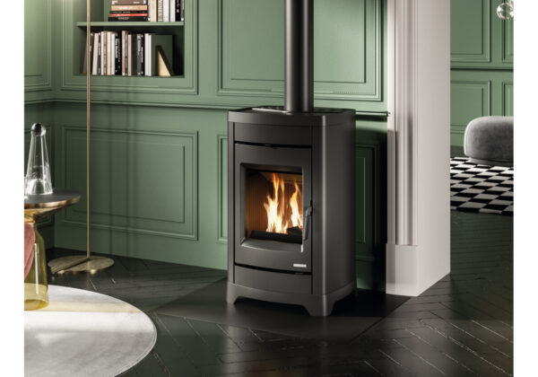 - Ξυλόσομπα με επένδυση από βαμμένο χάλυβα και πάνω και βάση από χυτοσίδηρο
